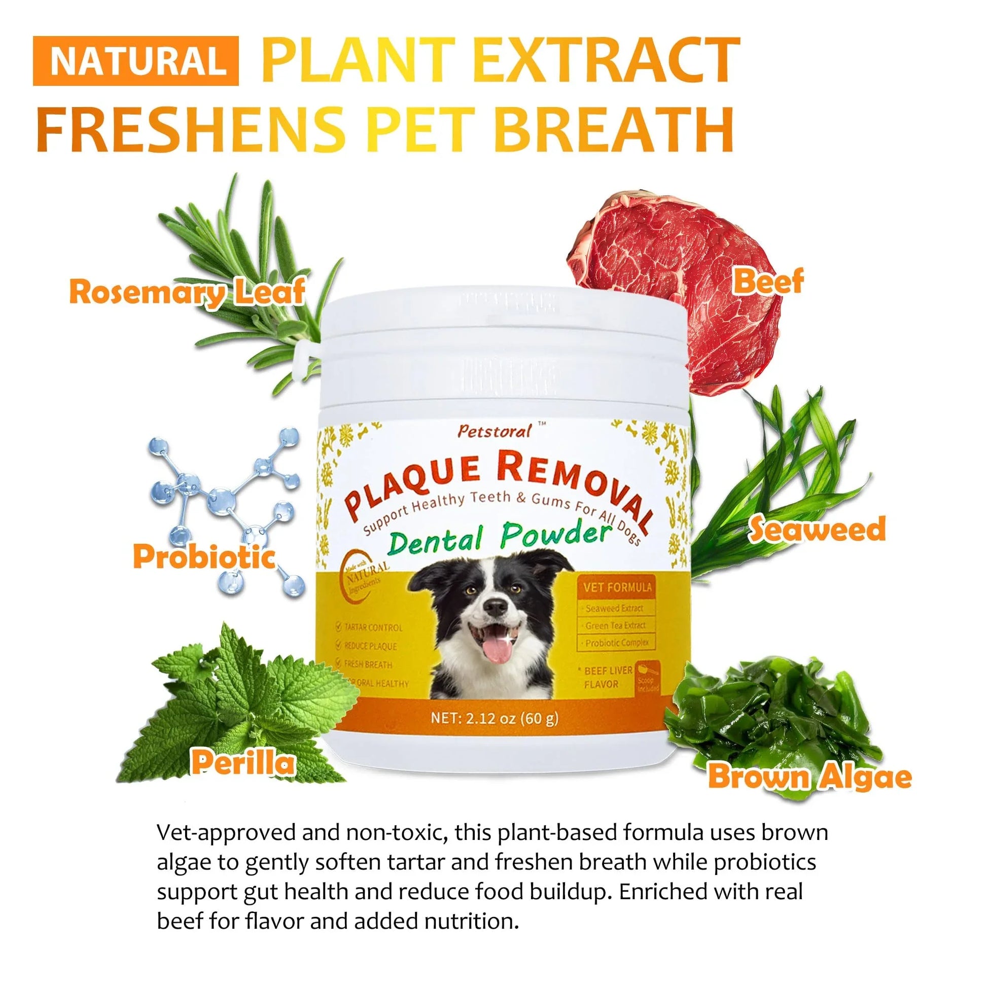 Keep your furry friend's smile bright and healthy with this comprehensive dental care set from Petstoral. The set includes a 2.82 oz plaque removal powder with a palatable beef liver flavor that dogs love, specially formulated with green tea extract and probiotic complex to support oral health. The powder helps reduce plaque buildup and freshen breath naturally. Complementing the powder are 50 convenient dental wipes designed for both cats and dogs, making daily dental maintenance simple and effective. These wipes help remove plaque and tartar while freshening breath. The combination of powder and wipes provides a complete solution for maintaining your pet's dental hygiene, supporting healthy teeth and gums. Regular use helps prevent common dental issues and promotes better oral health for your beloved pets.